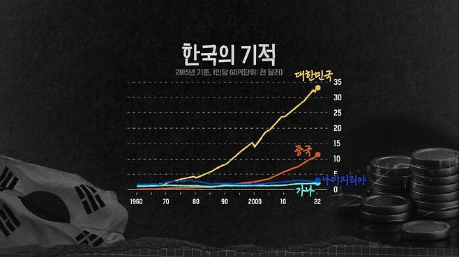 이게 1960년대를 기준으로 경제 성장률을 그린 거거든요. 여러분 생각하시기에 중국이 훨씬 많이 발전한 거 아니야? 그럴 수 있는데. 중국이 엄청 가난했다가 세계적인 경제 대국이 됐는데 그럼 중국이 높아야 되잖아요. 근데 비율로만 따지면 중국은 한국 쫓아오지도 못합니다. 이걸 보여드리는 이유는 우리가 자부심을 가져야 되고 산업화를 이끄신 모든 분들에게 감사하자 이 얘기를 하려는 게 아닙니다. 우리가 미래를 설계할 때 한국의 정확한 위치가 무엇이었고 성공하게 해 줬던 조건들이 무엇이었느냐에 대해서 좀 더 객관적으로 파악하려는 노력이 지금 필요하다는 겁니다.