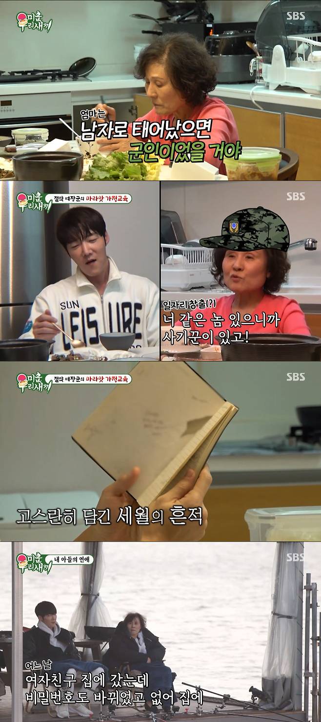 '미우새' 아들 최진혁이 어머니와의 특별한 하루를 공개했다. 어머니와의 여행을 위해 짐을 챙기는 진혁은 정작 속옷과 수건을 빼놓는 등 허당 매력을 보였다. 진혁 母는 "유치원 때부터 그러더니, 그러고 장가가면 여자가 얼마나 답답하겠냐"라며 잔소리 직격탄을 날였다. 이어 진혁의 경제관념을 지적하기 시작한 진혁 母는 "너 같은 놈이 투자하니까 버는 놈이 있어. 너 같은 놈이 있으니 사기꾼이 있는 거고"라고 말해 최진혁을 꼼짝 못 하게 만들었다. 이어 진혁 母는 "여자가 간판 보고 왔다가 얼마나 실망하겠냐"라며 잔소리 폭격을 이어가 폭소를 자아냈다. 어머니가 일기장처럼 20년간 꾸준히 써온 가계부를 들여다보며 추억에 젖은 진혁 母子의 모습에 母벤져스 모두가 감동하는 모습을 보였다.