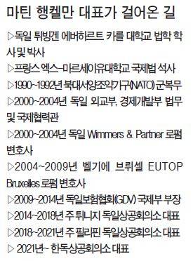 행켈만 대표는 지난 2021년 코로나 팬데믹 시기에 한독상의 대표에 취임했다. 그 해 ‘한독상의 40주년’에 이어 지난해 ‘한독수교 140주년’을 기념하는 굵직한 행사들을 잇달아 치렀다. 그 사이 한국과 독일의 교역 규모도 빠르게 성장하며 서로에게 더욱 중요한 파트너로 자리매김했다.