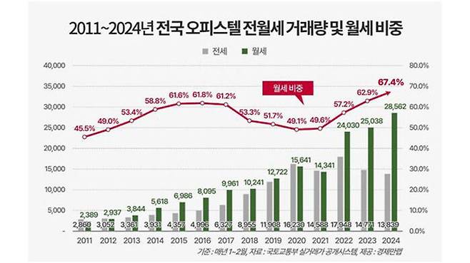 이 중 전세 거래량은 1만 3천839건, 월세 거래량은 2만 8천562건으로 월세 비중이 67.4%를 차지했습니다.