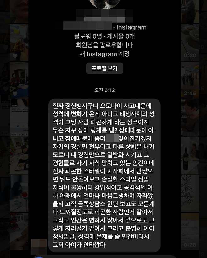 이 누리꾼은 강원래에게 "진짜 정신병자구나. 오토바이 사고 때문에 성격에 변화가 온 게 아니고 태생 자체의 성격이 그냥 사람 피곤하게 하는 성격이지. 무슨 자꾸 장애 핑계를 댐?"이라며 도를 넘은 악플을 보냈다.