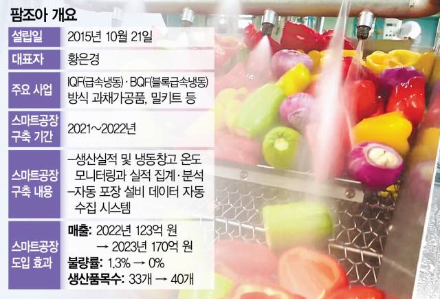 황 대표는 “농산물의 경우 하루하루 품질이 다르고 농식품 분야에서 스마트공장을 도입한 곳이 많지 않아 로우데이터(원데이터) 수집부터 어려운 과정이 있었지만 전 직원들이 합심해 노력하면서 성공적으로 도입할 수 있게 됐다”며 “시스템 구축 후 공정별 데이터를 실시간으로 수집·관리하면서 주문부터 생산, 출하까지 정확한 현황 파악과 계획적인 생산 관리가 가능해졌다”고 말했다. 팜조아는 스마트공장 도입 이후 완제품 불량률은 기존 1.3%에서 0%로 감소했고, 생산성 효율성 증대로 생산품목수도 33개에서 40개로 늘었다. 이로 인해 2022년 123억 원 이었던 매출은 단 1년 만에 40% 가까이 증가한 170억 원을 기록했다.