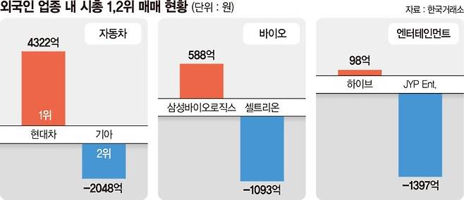 바이오업종의 시총 1위인 삼성바이오로직스와 2위 셀트리온에 대해서도 온도차를 보이고 있다. 삼성바이오로직스는 588억원 순매수한 반면, 셀트리온 주식은 1093억원어치를 팔아치웠다.