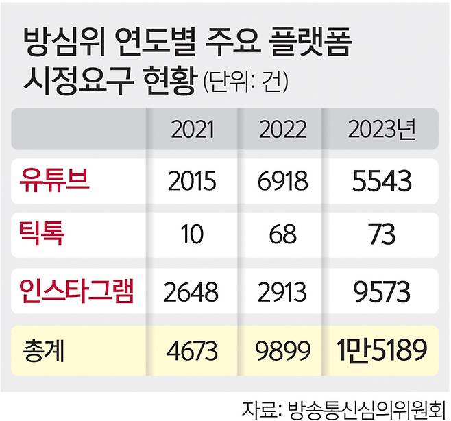 각종 불법 콘텐츠 증가로 플랫폼을 포함한 전체 심의도 늘고 있다. 2021년 총 15만3085건이던 방심위의 심의는 2022년 24만8130건, 지난해 26만4920건으로 급증했다. 위반 내용별로는 불법 촬영물과 딥페이크 성적 허위 영상 등 디지털 성범죄가 6만6909건으로 가장 많았다.