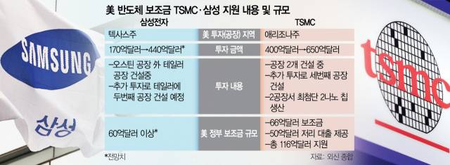 미 정부가 TSMC에 예상을 뛰어넘는 보조금을 지급하기로 한 가운데 다음 주 발표될 삼성전자에 대한 보조금 규모에 관심이 집중된다. 월스트리트저널(WSJ)은 최근 삼성전자가 미국 텍사스주에 대한 투자 규모를 기존 170억 달러에서 440억 달러로 대폭 늘리기로 하고 15일 텍사스주 테일러에서 이 같은 계획을 발표하는 행사를 열기로 했다고 보도했다. 삼성전자는 2021년 기존 텍사스주 오스틴 공장 외에 텍사스주 테일러에 170억 달러를 들여 새 반도체 공장을 건설하겠다고 밝혔으며 이번 추가 투자로 테일러에 기반을 둔 두 번째 공장을 짓고 새 공장에 인공지능(AI) 반도체 생산을 위한 첨단 패키징 시설을 마련할 것으로 알려졌다. 이와 관련해 블룸버그통신은 삼성전자가 60억 달러 이상의 보조금을 받을 것으로 관측된다고 전한 바 있다. 삼성전자가 해당 보도의 내용처럼 총 440억 달러를 투자하고 60억 달러를 받게 되면 보조금은 투자액 대비 13.6% 수준이 된다. 대만 TSMC의 이번 투자액 대비 보조금 비율은 10.2%다.