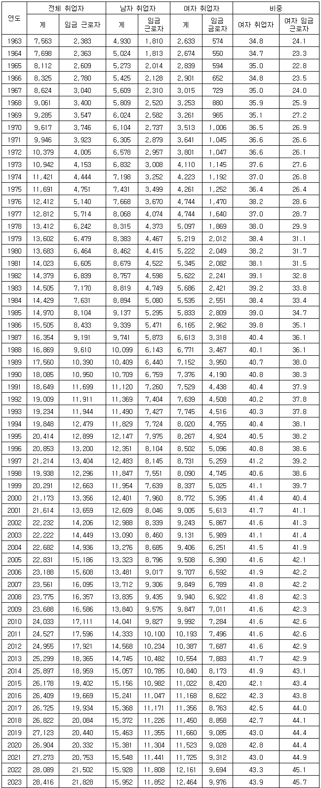 [표] 여성 취업자·임금근로자 비중 추이 (단위: 천명, %)