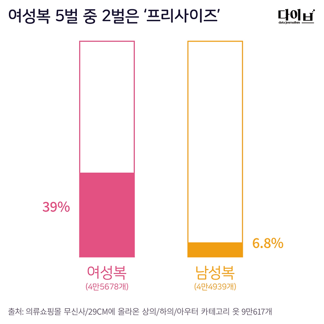 8일 경향신문 데이터저널리즘팀 다이브가 대표적인 의류 온라인 쇼핑몰인 무신사와 29CM에서 최근 올라온 여성복 4만5678개의 상품 데이터를 수집해 분석한 결과 전체의 39%(1만7835개)가 프리사이즈로 판매되고 있었다. 5개 중 2개가 프리사이즈인 셈이다. 남성복이 4만4939개 중 6.8%(3034개)만 프리사이즈인 것과 비교해 보면 여성복의 프리사이즈 판매가 두드러진 편이다. 여성복은 사이즈 숫자 자체도 적었다. 남성복은 의복 한 벌당 평균 3.3종의 사이즈를 갖고 있는 반면, 여성복은 사이즈가 한 벌당 평균 2종에 불과했다.