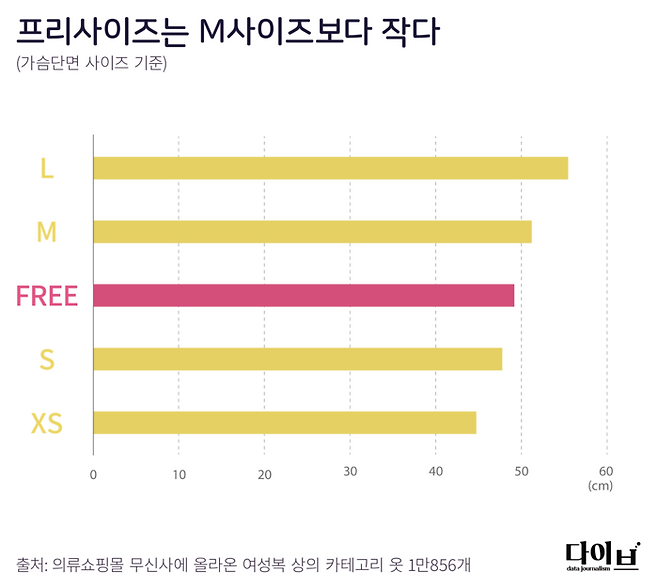 여성복의 프리사이즈는 얼마나 ‘작은’ 사이즈일까? 쇼핑몰에 올라온 의류에 기재된 치수를 수집해 보니 무신사의 여성복 상의 1만856개 중 프리사이즈의 평균 가슴단면은 49.1㎝로, 중간 사이즈라고 할 수 있는 M사이즈 평균 51.2㎝보다 작았다. 그보다 작은 S사이즈 평균 47.8㎝보다는 약간 큰 편이었다. 총장의 경우는 프리사이즈 평균이 55.8㎝로 S사이즈 평균 55.8㎝와 거의 똑같았다. 가장 작은 XS사이즈의 총장 평균 54.3㎝와도 큰 차이가 나지 않았다. 무신사의 한 남녀공용 반팔 셔츠는 S, M, L 사이즈로 판매하는데 이 중 가장 작은 S사이즈를 ‘여성 전용 프리사이즈’라고 표기하기도 했다.