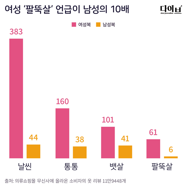 여성이 작성한 리뷰에는 ‘허리’(3893회), ‘엉덩이’(1054회), ‘팔뚝’(174회)과 같은 신체와 관련된 단어도 남성보다 많았다. 남성이 작성한 리뷰에서는 같은 단어인 허리가 4034회, 엉덩이 376회, 팔뚝 25회에 그쳤다. 수집한 리뷰 중 남성이 작성한 것이 여성의 2배 가까이 많다는 점을 감안하면 신체 관련 언급이 상대적으로 훨씬 더 많다고 볼 수 있다.