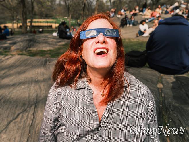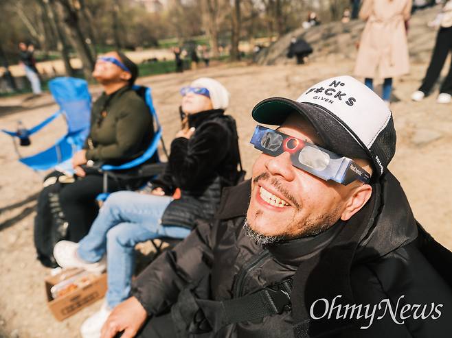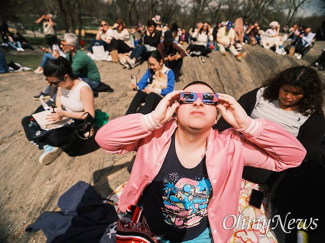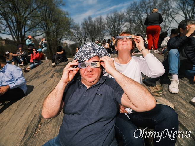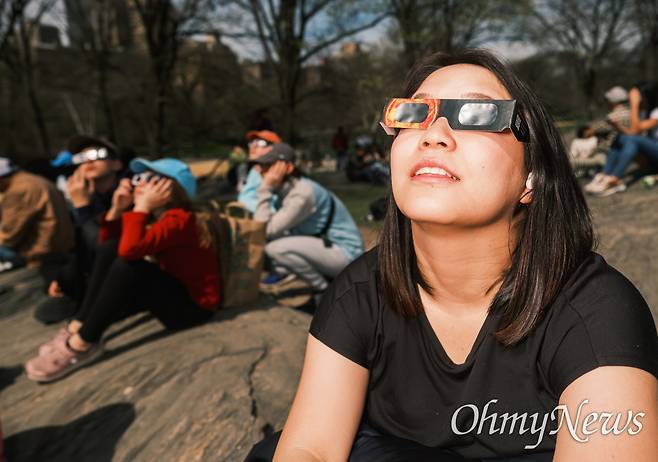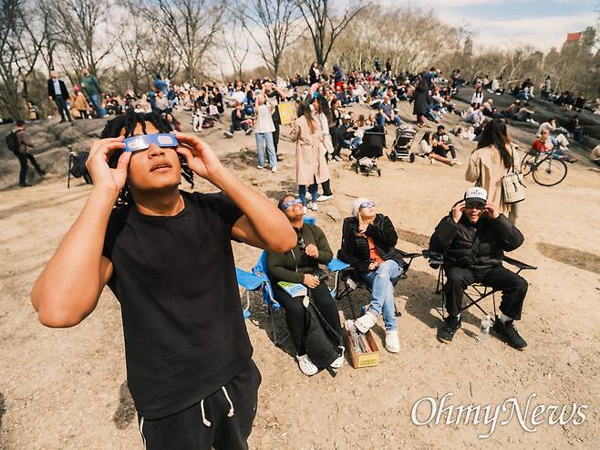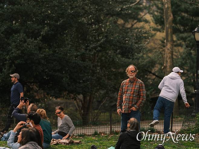 | ▲ 미국 현지시각 8일 오후 뉴욕 맨해튼 센트럴파크에서 시민들과 관광객들이 개기일식을 관찰하고 있다. |