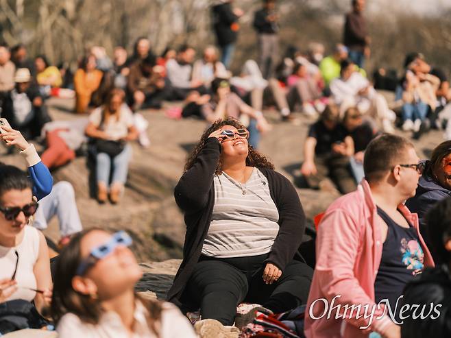 이날 뉴욕 맨해튼 센트럴파크는 개기일식을 관찰하기 위해 이곳을 찾은 주민들과 관광객들로 붐볐다. 그들은 바위와 잔디 위에 편안한 자세로 누워 봄날씨를 즐기며 개기일식을 기다렸다.