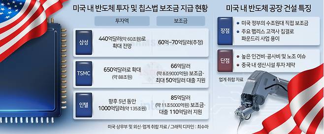 반도체 업계 관계자는 “미국 반도체 공장을 짓고 운영하는데 들어가는 비용이 동북아 지역 공장보다 훨씬 높다”며 “미국 정부로부터 수조원대 보조금 뿐 아니라 저리 대출, 세제혜택 등을 전부 다 받아야 겨우 동북아 생산거점의 공장 생산성과 겨우 비슷한 수준을 맞출 수 있다”고 말했습니다.