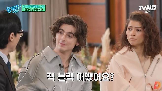 또 유재석이 과거 MBC '무한도전'에서 만났던 할리우드 배우 잭 블랙에 대해 "되게 푸근하고 재밌다. 모든 걸 받아주는 스타일이다"고 언급하자, 티모시 샬라메와 젠데이아는 "잭 블랙을 만나본 적이 없다"며 신기해했다.