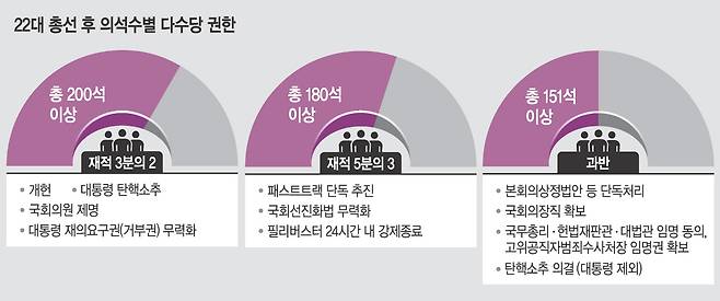 야당은 개헌은 물론이고, 윤 대통령에 대한 국회의 탄핵소추도 가능하다. 이에 여당에서는 ‘범야권 200석’을 막아달라고 호소하고 있다. 한동훈 국민의힘 비상대책위원장은 9일 메시지를 내고 “야당이 범죄자 공천하고, 막말 공천하고, 여성비하 공천하고도 200석을 얻겠다고 큰소리를 치고 있다”며 “결국 국민을 믿을 수밖에 없다. 이렇게 무도하고 뻔뻔한 야당을 견제할 수 있는 최소한의 의석을 주시라”고 호소했다.