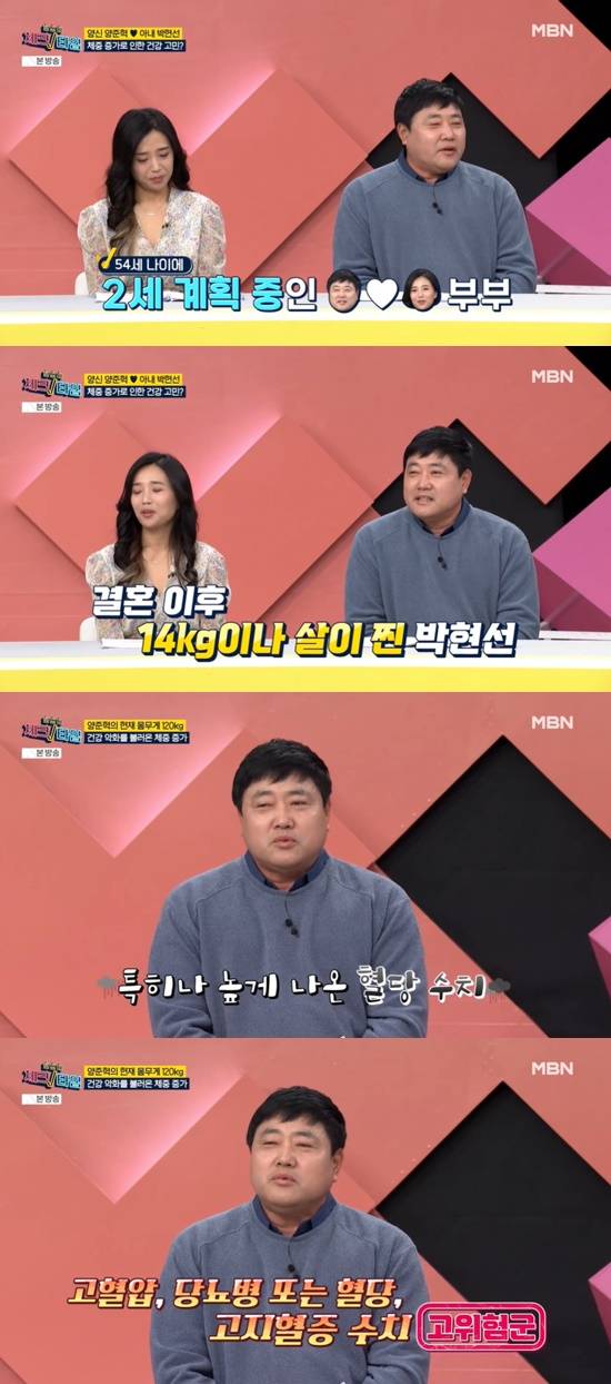 양준혁은 "결혼하고 나서 살이 많이 쪄서 고민이다. 선수 시절보다 20kg 더 쪄서 현재 120kg 다", "나이 들수록 살 빼는 게 힘들고 몸이 망가지는 느낌"이라고 밝혀 스튜디오를 놀랍게 만들었다.