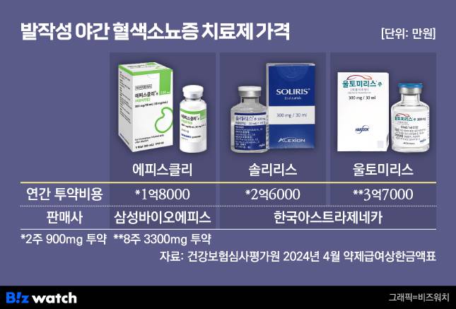 에피스클리는 솔리리스와 마찬가지로 울토미리스보다 투약 편의성이 떨어지지만 가격 측면에서는 여전히 경쟁력을 지니고 있다. 울토미리스는 8주마다 1회 3300㎎씩 투여할 경우 1년 약값이 약 3억7000만원으로 에피스클리보다 1억9000만원가량 비싸다.