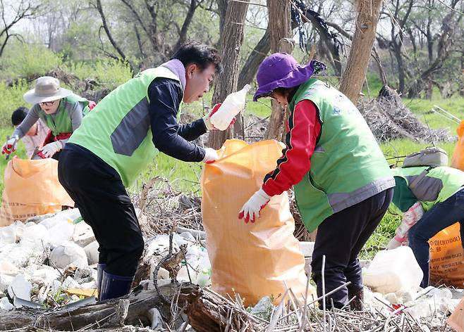 [청주=뉴시스] 임선우 기자 = 이범석 충북 청주시장(왼쪽)이 9일 미호강 일원에서 청주시 자연환경보전협의회 회원들과 함께 환경정화활동을 하고 있다. (사진=청주시 제공) 2024.04.09. photo@newsis.com