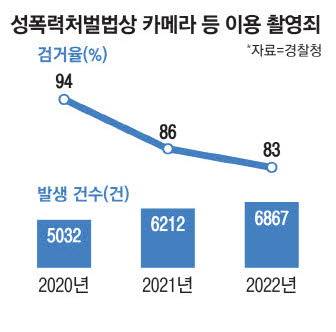 다른 사람 신체를 몰래 찍거나 그 촬영물을 유포하면 성폭력범죄의 처벌 등에 관한 특례법상 5년 이하 징역 또는 1000만원 이하 벌금형에 처해질 수 있다. 그럼에도 몰카를 활용한 범죄는 최근 증가하는 추세다. 9일 경찰청에 따르면 몰카 범죄 발생 건수는 2019년 5762건에서 2022년 6867건으로 3년 새 19% 늘었다. 하지만 검거 건수는 같은 기간 5440건에서 5702건으로 증가하는 데 그쳐 검거율은 94.4%에서 83.1%까지 떨어졌다. 몰카 기기가 첨단화되면서 검거에 어려움을 겪고 있는 것이다.