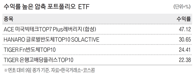 분산투자가 가능한 펀드의 장점을 유지하면서도 특정 업종을 대표하는 대형주에 집중투자하는 압축포트폴리오 상장지수펀드(ETF)가 올해 뛰어난 성적을 거두고 있다.