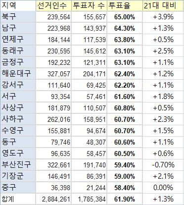 부산 16개 구·군 대부분이 지난 총선에 견줘 높은 투표율을 보이고 있으나, 부산진구는 현재 기준 투표율 59%로 지난 총선 때보다 0.7%p 낮은 참여율을 기록하고 있다.
