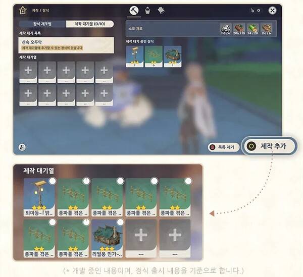 ② 부족하지만 제작 가능한 장식은 '포롱이 → 장식 제작' 화면에서 제작 대기 목록에 추가할 수 있다. 제작 대기 목록에 있는 장식은 일괄적으로 제작 대기열에 추가해서 제작할 수 있다.