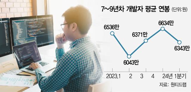 10일 채용 플랫폼 ‘원티드’를 운영하는 원티드랩에 따르면 7~9년 경력을 가진 개발자의 평균 연봉은 지난해 1분기 6536만 원에서 올 1분기 6343만 원으로 3.0% 하락했다. 10년 정도 쌓은 경력을 바탕으로 제품·서비스 개발을 이끌 수 있는 팀장급 인력 연봉이 되레 줄어든 것이다. 물가 상승률까지 감안하면 구직자들이 느끼는 연봉 감소 폭은 더 크다.