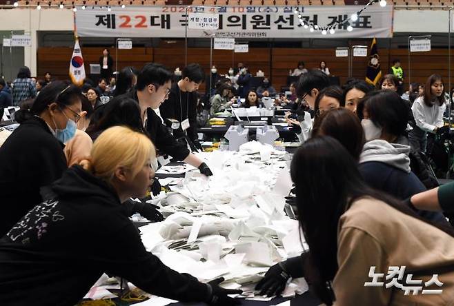 제22대 국회의원 선거일인 10일 오후 서울 관악구 서울대 체육관에 마련된 개표소에서 개표사무원들이 개표 작업을 하고 있다.