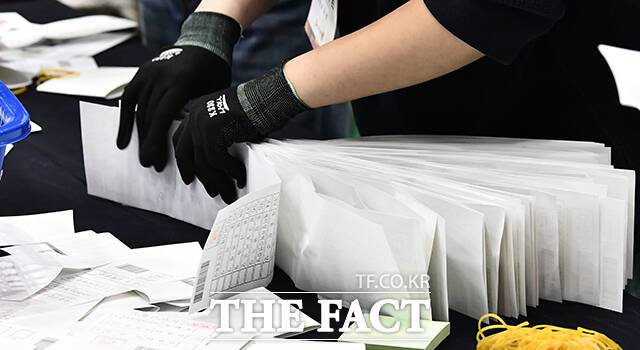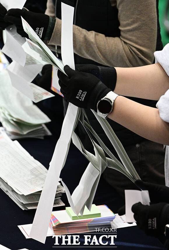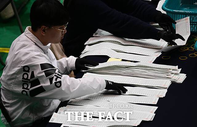 [더팩트ㅣ박헌우 기자] 제22대 국회의원선거 날인 10일 오후 서울 관악구 서울대학교에 마련된 개표소에서 개표사무원들이 투표용지를 정리하고 있다.