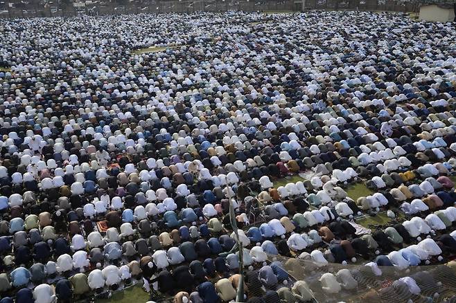 10일 파키스탄 최대 도시 카라치에서 무슬림들이 이슬람 금식 명절 ‘라마단’의 종료를 기념하는 기도를 올리고 있다. 라마단이 끝나면 성대한 음식을 즐기는 축제인 ‘이드 알피트르’가 벌어진다. 다만 이란이 10일 전후로 이스라엘 직접 공격을 예고해 중동 지역의 긴장이 고조되고 있다.