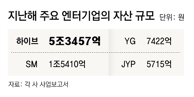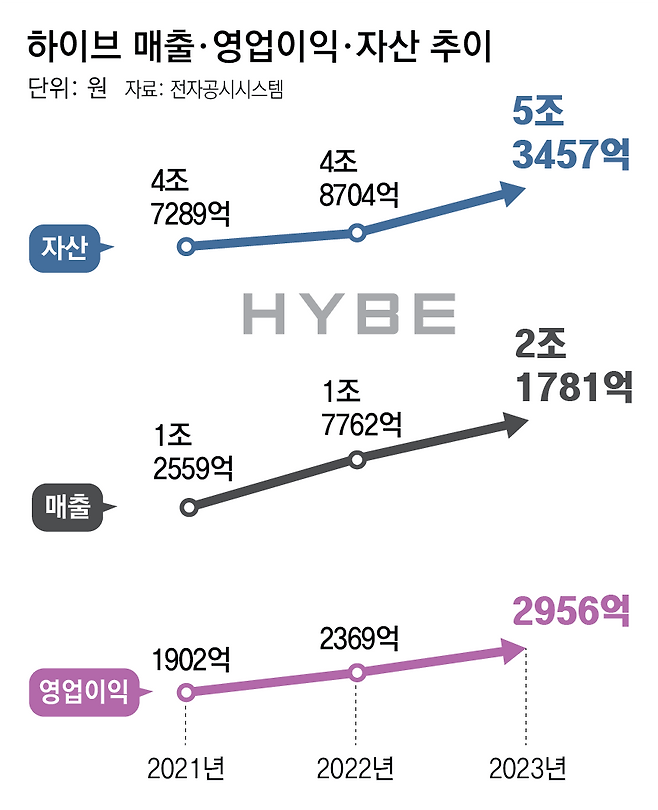 2005년 빅히트엔터테인먼트로 설립된 하이브는 BTS가 2017년 세계적인 인기몰이를 하면서 중소 기획사에서 주요 플레이어로 올라섰다. BTS 멤버가 모두 군에 입대했지만 뉴진스, 르세라핌 등 이른바 ‘4세대 걸그룹’이 성공을 거두면서 BTS의 공백을 메웠다. 올해에도 보이그룹 투어스와 걸그룹 아일릿을 데뷔와 동시에 잇따라 성공시키기도 했다.