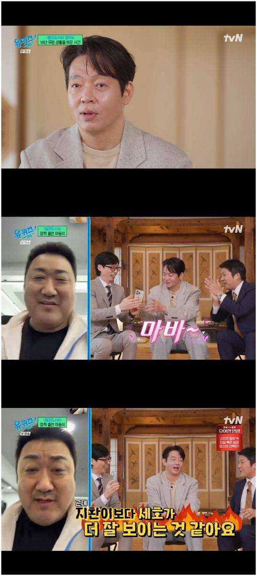 이런 박지환의 유퀴즈 출연에 기쁨을 나타낸 건 마동석과 정경호였다. 마동석은 "지환아 네가 성공해서 유퀴즈에 출연하는구나 정말 축하한다"라며 감격한 미소를 지었고, 정경호는 운동 중 민낯으로 "유퀴즈 나왔네!"라며 영상 통화 화면 가득 얼굴을 들이밀며 순수한 축하를 건네 웃음을 안겼다./osen_jin0310@osen.co.kr