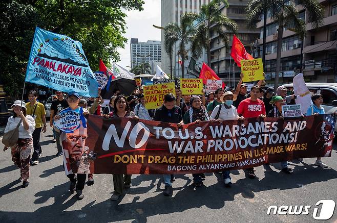 (마닐라 로이터=뉴스1) 정지윤 기자 = 11일(현지시간) 필리핀 마닐라에서 미-일-필 3국 정상회의가 열리는 동안 시위대가 거리를 행진하고 있다. 2024.04.11
