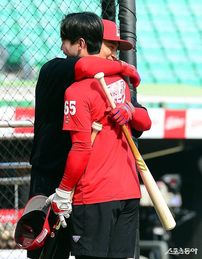 11일 인천 SSG 랜더스필드에서 ‘2024 신한 SOL 뱅크 KBO리그’ SSG 랜더스와 키움 히어로즈의 경기가 열린다. 경기 전 부상이후 1군에 복귀한 SSG 추신수가 김정민과 반갑게 포옹을 나누고 있다.