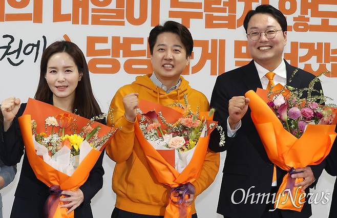 | ▲ 4.10 총선 경기 화성을에서 당선된 이준석 개혁신당 대표와 비례대표로 당선된 이주영·천하람 총괄선대위원장이 11일 오후 서울 여의도 국회에서 열린 개혁신당 중앙선거대책위원회 해단식에서 축하 꽃다발을 들고 기념촬영을 하고 있다. |