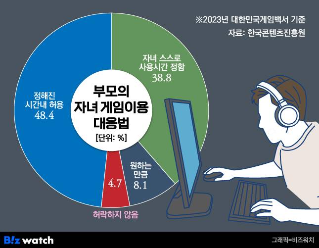 응답자의 50% 가까이는 시간을 정해두고 게임을 이용하도록 허용하고, 40%가량은 자녀 스스로 이용 시간을 정하도록 하는 등 건전한 게임 문화가 자리 잡고 있다.