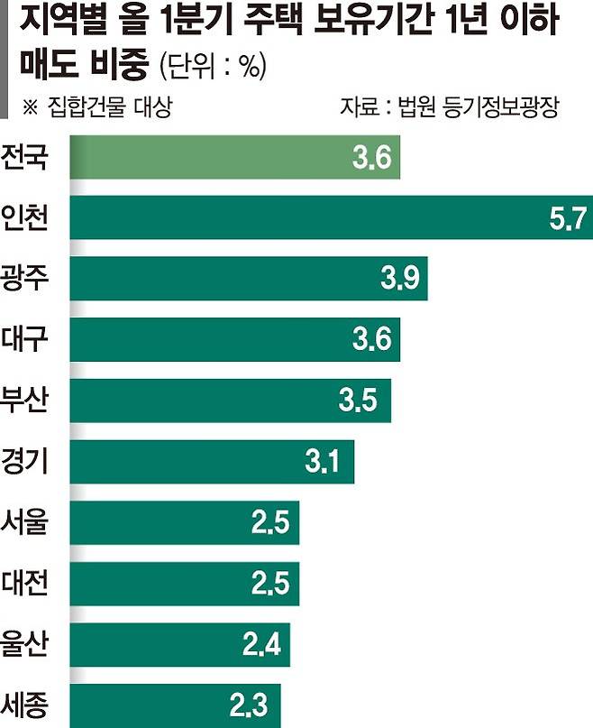 올해 1·4분기에 주택 보유기간 1년 이하 비중이 가장 높은 지역은 인천으로 5.7%에 달한다. 같은기간 인천에서는 7642건의 매매 소유권이전등기 신청이 이뤄졌다. 이 중 보유기간 1년 이하 매도인은 438건으로 집계됐다.