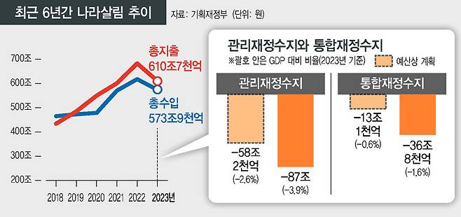 총지출은 본예산에 견줘 28조원 줄어든 610조7천억원이다. 예상보다 세수가 덜 들어오자 재정 지출을 공격적으로 줄인 셈이다. 예산보다 줄어든 지출 규모는 전체 예산(본예산 총지출)의 4.4% 규모이자 같은해 국내총생산(GDP)(2236조3천억원·잠정)의 1.3%에 이른다. 이에 따라 2022년 총지출(결산 기준)에 견줘 지난해 총지출은 71조7천억원 쪼그라들었다. 그만큼 부진한 경기의 마중물 구실을 정부 재정이 제대로 하지 못했다는 의미다.