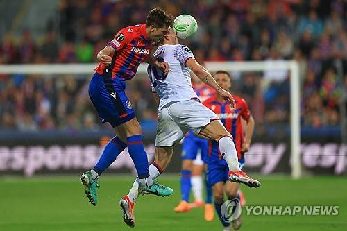 epa11273244 Robin Hranac (L) of Viktoria Plzen in action against Andrea Belotti of Fiorentina during the UEFA Europa Conference League quarter-finals, 1st leg soccer match between Viktoria Plzen and ACF Fiorentina, in Plzen, Czech Republic, 11 April 2024. EPA/MARTIN DIVISEK