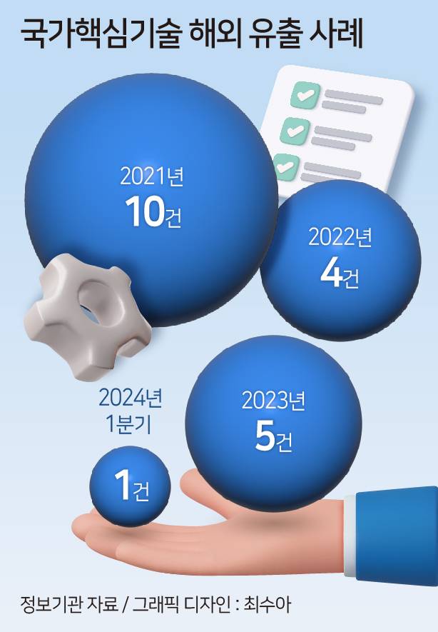 브로커가 활개치면서 기술유출사건은 매년 증가세에 있다. 경찰에 따르면 최근 3년간 국내외 산업기술 유출사범은 △2021년 89명(국내유출 80·해외유출 9) △2022년 104명(92·12) △2023년 149명(127·22)으로 매년 증가세다. 해외유출의 경우 열에 아홉은 중국이라고 관계자들은 전한다. 정보기관에 따르면 국가핵심기술(13개 분야)을 해외 유출한 사례도 2021년 10건, 2022년 4건, 2023년 5건, 2024년(1분기) 1건으로 집계된다.