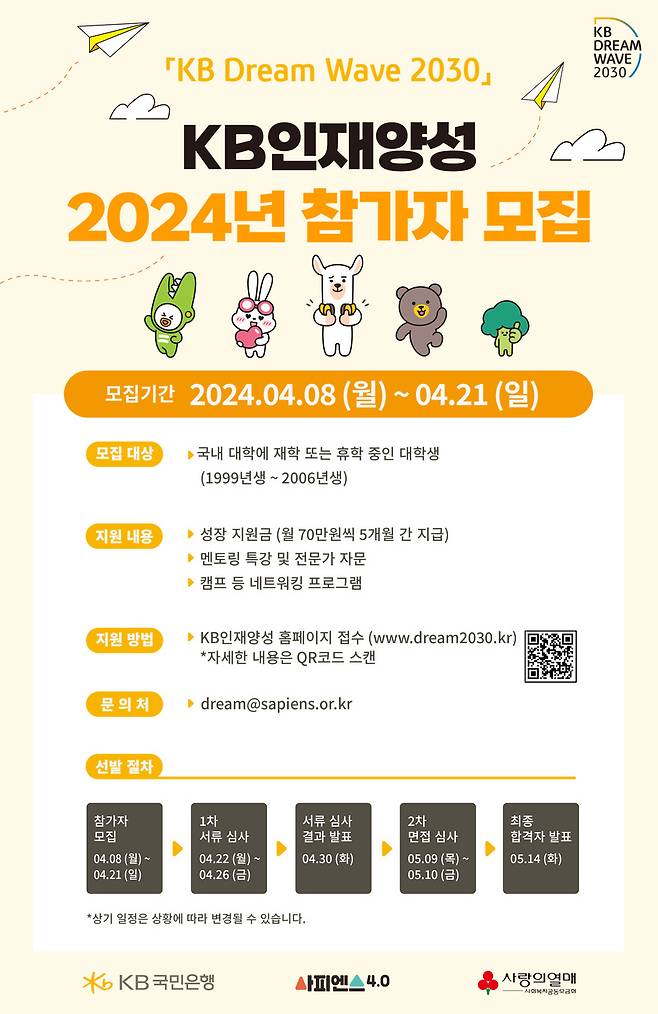 KB국민은행은 오는 21일까지 사피엔스4.0 홈페이지를 통해 1999년생부터 2006년생 국내 대학에 재학 또는 휴학 중인 대학생을 대상으로 ‘KB인재양성’ 참가자를 모집한다고 오늘(14일) 밝혔습니다.