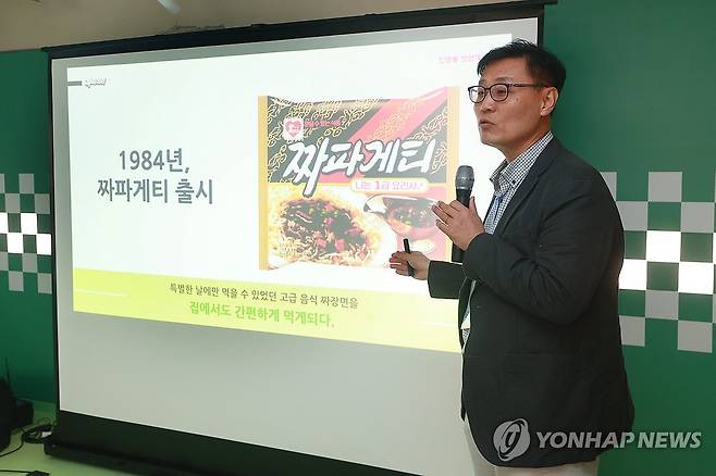 (서울=연합뉴스) 진연수 기자 = 12일 서울 성동구 플랜트란스에서 열린 농심 '짜파게티 분식점' 팝업스토어 미디어행사에서 심규철 농심 면마케팅실 상무가 발표를 하고 있다. 2024.4.12