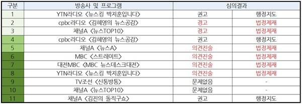 의견진술을 진행한 4건 모두 제재가 결정되었습니다. cpbc라디오 <김혜영의 뉴스공감>, 채널A <뉴스TOP10>이 법정제재 경고를 받았습니다. 이로써 제22대 국회의원선거 선방심의위에서 지금까지 확정된 법정제재 건수는 20건입니다.