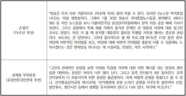손형기 위원(TV조선 추천)의 경우 위와 같은 주장을 하면서 "KBS나 SBS 등 이런 뉴스들을 보니 더불어민주당 공천관리위원회에서 현역 의원 공천 배제 기사가 있었다. 그리고 검찰에서 특혜 채용 의혹이 불거진 문재인 전 대통령 사위에 대한 참고인 조사도 있었다"라고 말하며 더불어민주당에 대해 비판적으로 다룰 수 있었는데도 왜 누락했느냐고 질문했는데요.