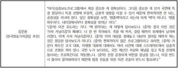제14차 선거방송심의위원회에서 나온 황당·편파 발언 세 가지입니다. 언론의 편향성을 지적하지만 위원 스스로의 객관적·중립적 태도를 먼저 견지하는 것이 필요해 보여 전문성 부족이 의심스러운 경우입니다.