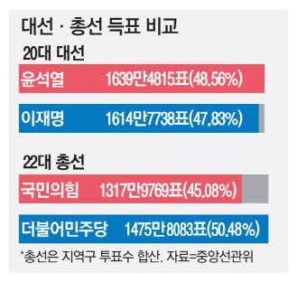 대선 당시 득표율과 비교하면 2년 만에 민심의 방향이 확 바뀐 것을 알 수 있다. 2022년 대선 때 윤 대통령은 1639만4815표(48.56%)를 득표해 1614만7738표(47.83%)를 얻은 이재명 민주당 대표를 24만7077표 차이로 제치고 당선됐다. 0.73%포인트 차이로 정권을 잡은 것이다. 윤 대통령을 지지한 유권자는 1639만여 명인 반면 이번에 국민의힘 지역구 후보를 지지한 사람은 1318만명에 그쳤다. 윤 대통령을 뽑았지만 이번에 국민의힘 후보를 뽑지 않은 사람이 321만명에 달하는 셈이다.