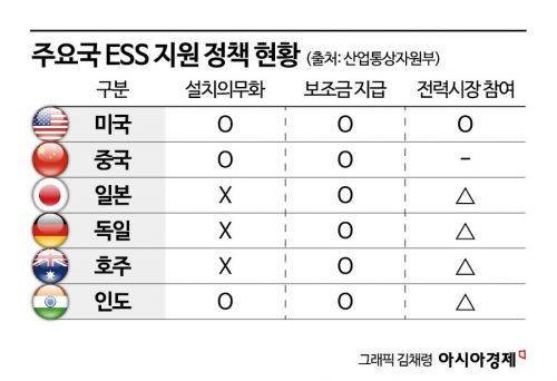정부는 지난해 10월 에너지스토리지 산업발전 전략을 발표했다. 하지만 주요국에서 도입하고 있는 보조금, 설치 의무화 등의 강력한 정책은 포함하지 않았다. 다만 정부는 저탄소 중앙계약 시장, ESS 연계 재생에너지 입찰 시장 등 시장 제도에 기반해 ESS 보급을 확대한다는 계획이다.