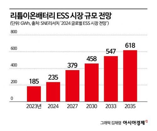 국내 에너지 전문 시장조사기관인 SNE리서치는 올해 리튬이온 배터리 ESS 시장 규모가 전년 대비 27% 성장한 235GWh를 기록할 것으로 전망했다. 이후 연평균 10.6% 성장하며 2035년에는 618GWh까지 커질 것으로 내다봤다.