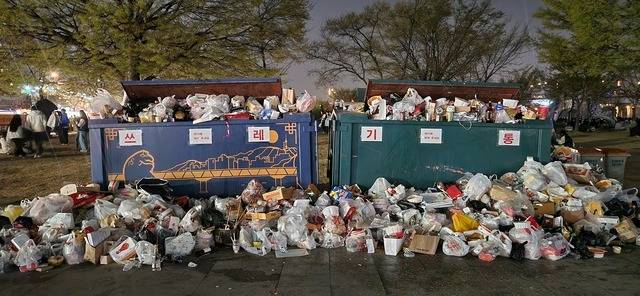 산처럼 쌓이는 쓰레기는 시가 청소 인력을 투입해 처리하고 있다. 벚꽃축제 같은 큰 행사 동안은 오후 11시부터 이튿날 오전 7시까지 별도 청소 인력을 투입해 처리한다고 시는 전했다.