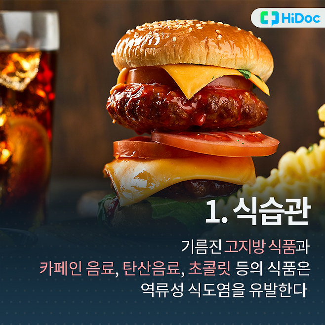 1. 식습관기름진 고지방 식품과 카페인, 탄산음료, 초콜릿 등 서구화된 식습관은 역류성 식도염의 주된 원인이다.