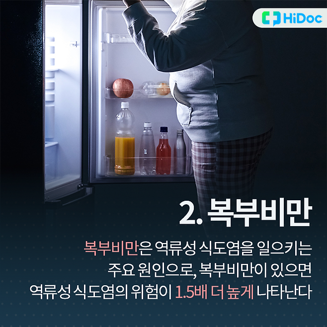 2. 복부비만복부비만이 있는 사람은 그렇지 않은 사람에 비해 역류성 식도염의 위험이 1.5배 더 높다.